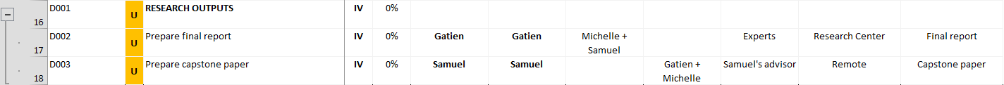 First, the team wants to hold a brainstorming session at the research center. Gatien is responsible and accountable for planning the discussion with the logistical support of Emma. Other experts are also invited (consulted) to participate in the brainstorming session.
